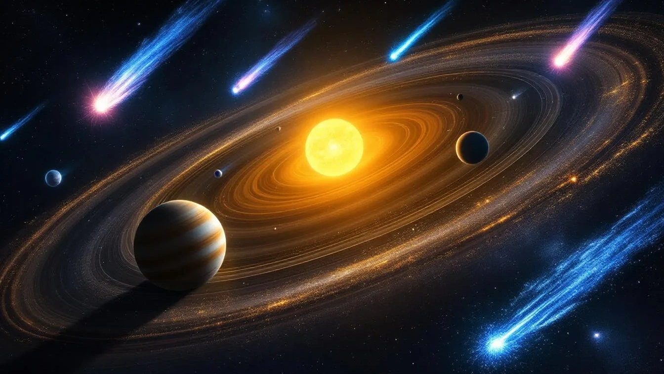 Kometen zijn niet alleen ijs- en stofblokken, maar ook de kosmische boodschappers van ons zonnestelsel. Ze zijn vaak afkomstig uit de Kuipergordel of de Oortwolk en hebben een elliptische baan die hen soms dicht bij de zon brengt. Dit resulteert in spectaculaire verschijningen als een coma en staarten zich vormen door de straling van de zon.